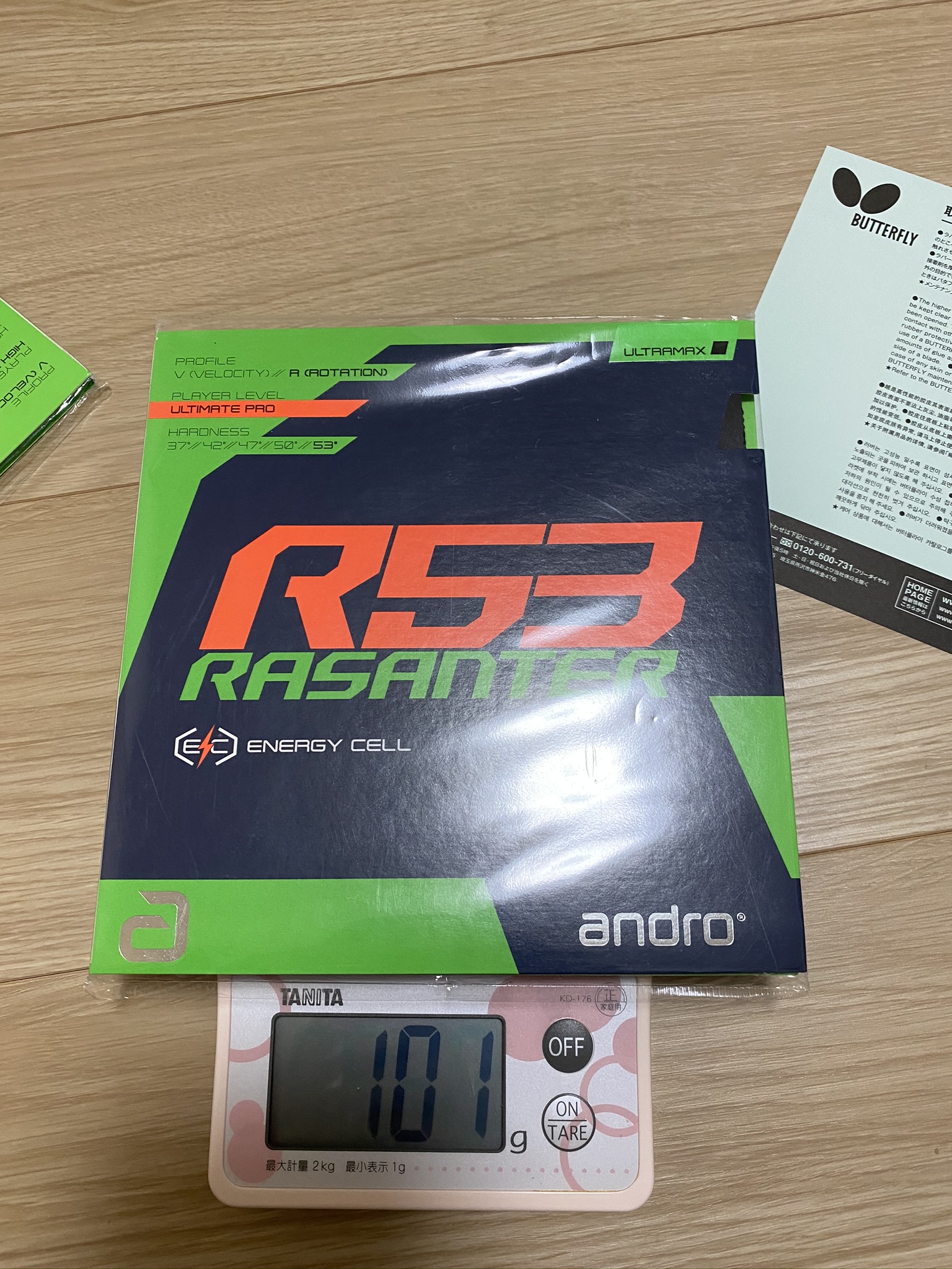 Spin:125、 Speed:118、 Control:87、 スポンジ硬度: 53° ラバー重量:52 g 硬度計評価 shore a (sheet):34.0、 shore a (sponge):29.9 shore c (sheet):47.0、 shore c (sponge):45.3 katsuo000のレビュー: https://katsuo000.com/review_rasanter_r53/