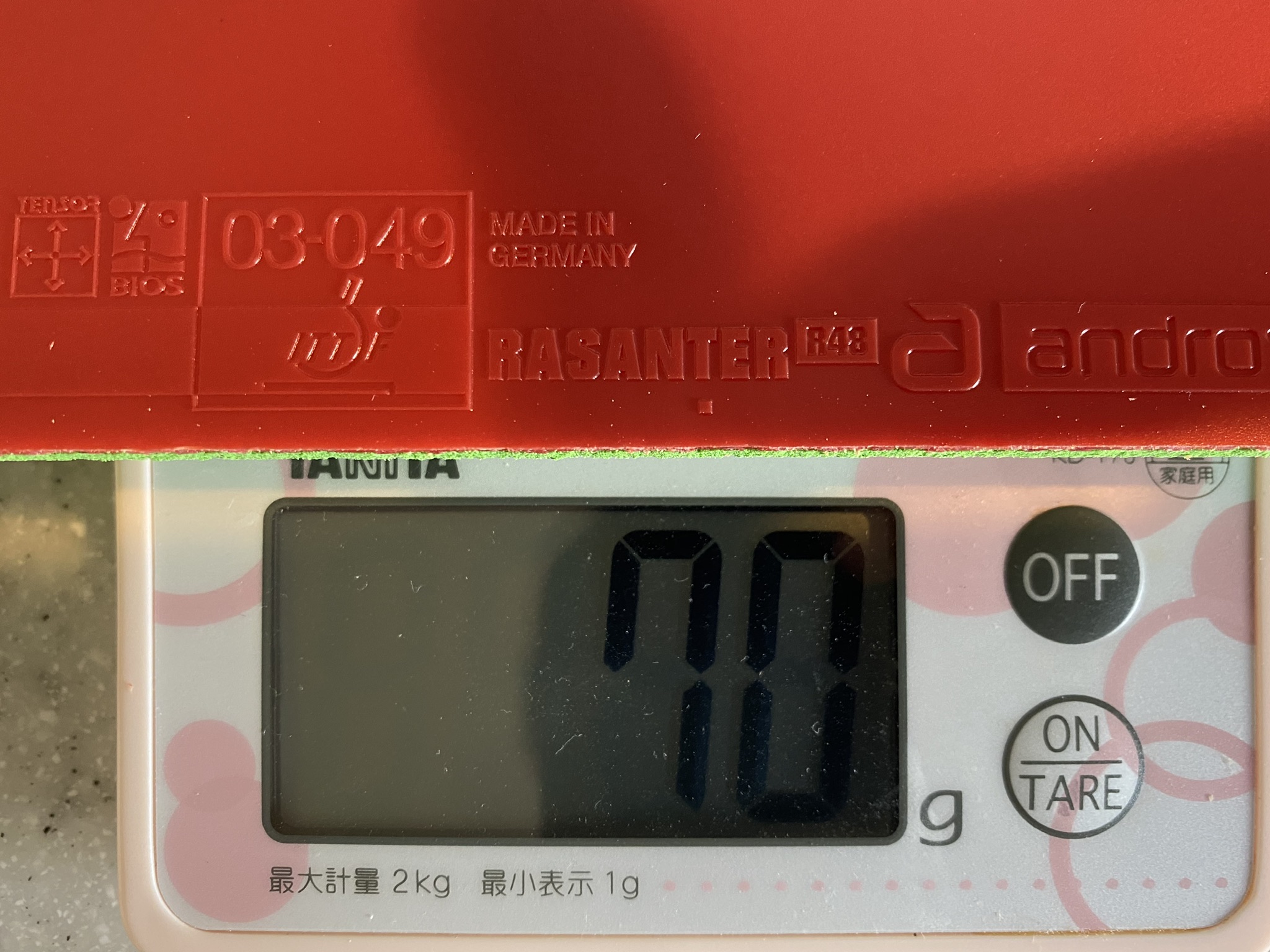 Spin:124、 Speed:119、 Control:89、 スポンジ硬度: 48° ラバー重量:48 g 硬度計評価 shore a (sheet):31.5、 shore a (sponge):25.3 shore c (sheet):39.6、 shore c (sponge):36.0 katsuo000のレビュー: https://katsuo000.com/review_rasanter_r48/