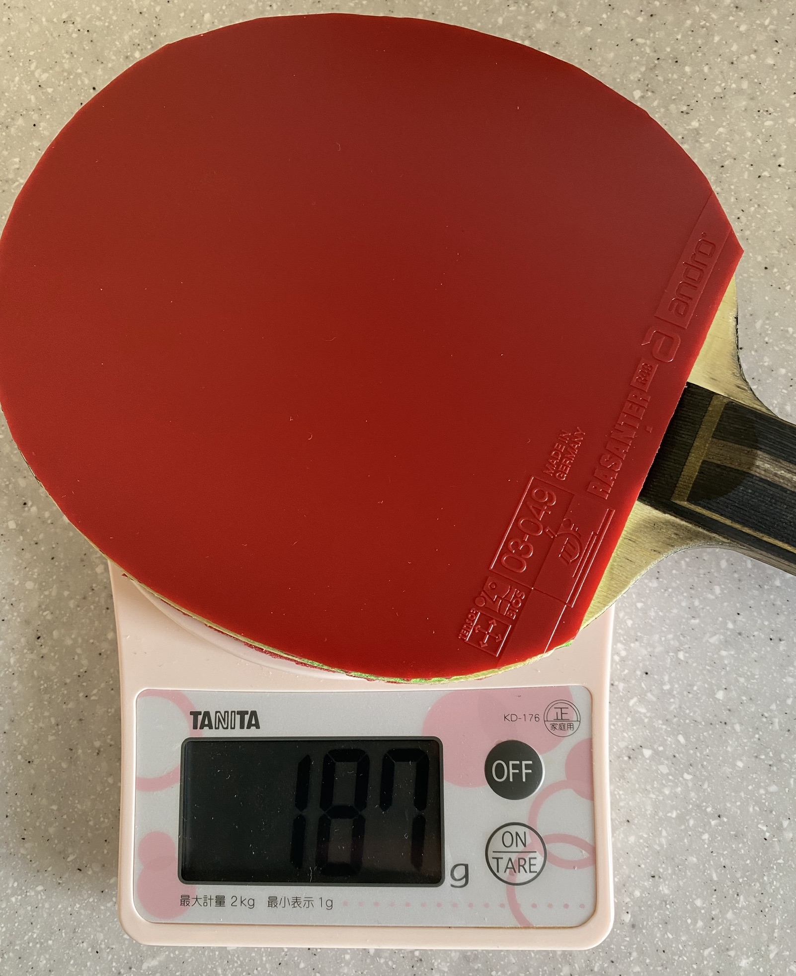 Spin:123、 Speed:117、 Control:91、 スポンジ硬度: 45° ラバー重量:49 g 硬度計評価 shore a (sheet):30.5、 shore a (sponge):24.5 shore c (sheet):43.1、 shore c (sponge):37.1 katsuo000のレビュー: https://katsuo000.com/review_rasanter_r45/