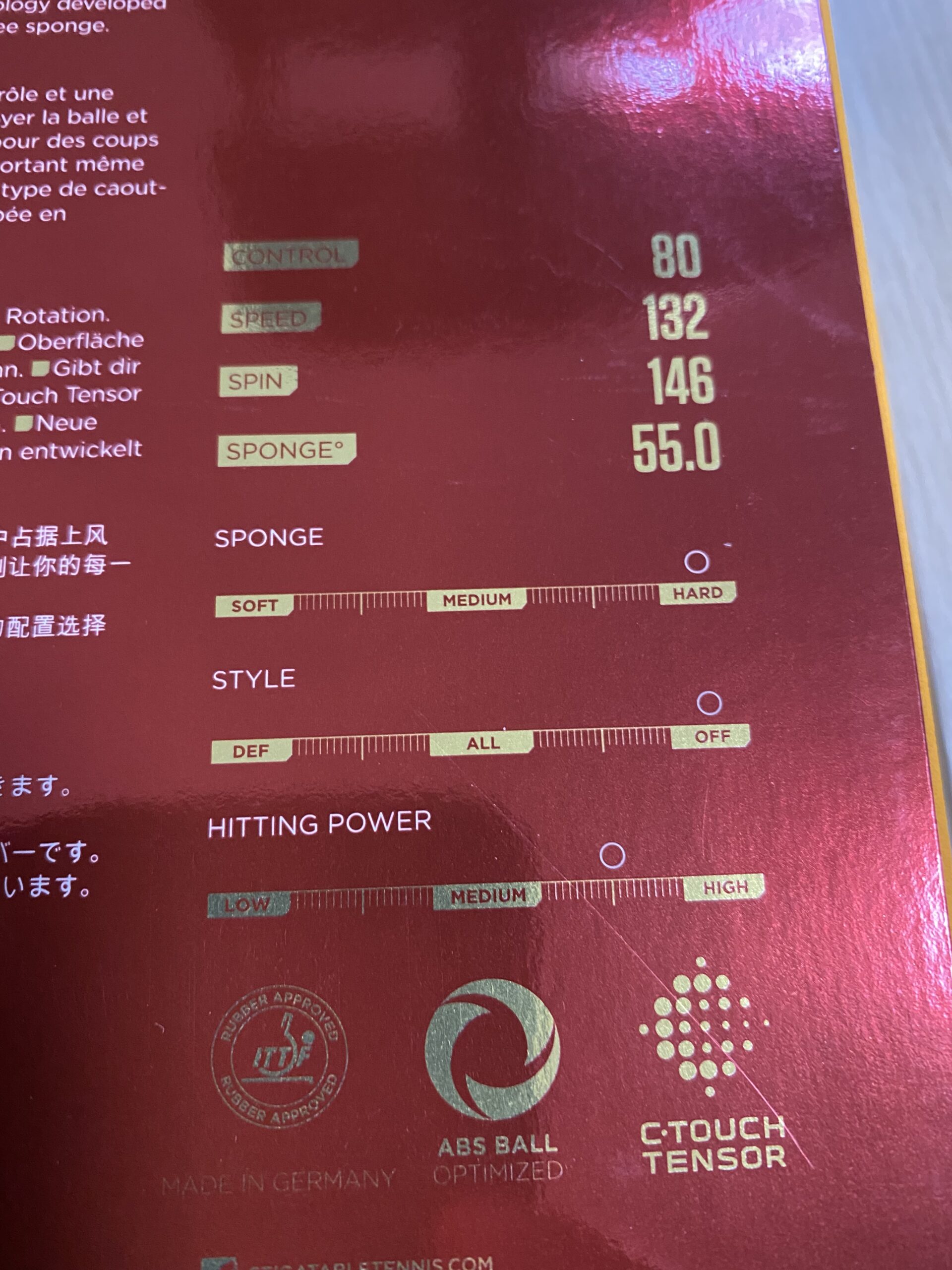 By the way, the sheet doesn’t feel very sticky. Recent German adhesive tension rubber does not have the sticky feeling of the sheet like Chinese adhesive rubber. The smell is a little peculiar, but compared to Chinese adhesive rubber, it is a level that even people who do not know table tennis do not mind. If it is not sold as an adhesive tension rubber, it will be difficult to recognize it as an adhesive rubber in the first place. Of course, the performance has the characteristics of adhesive rubber!