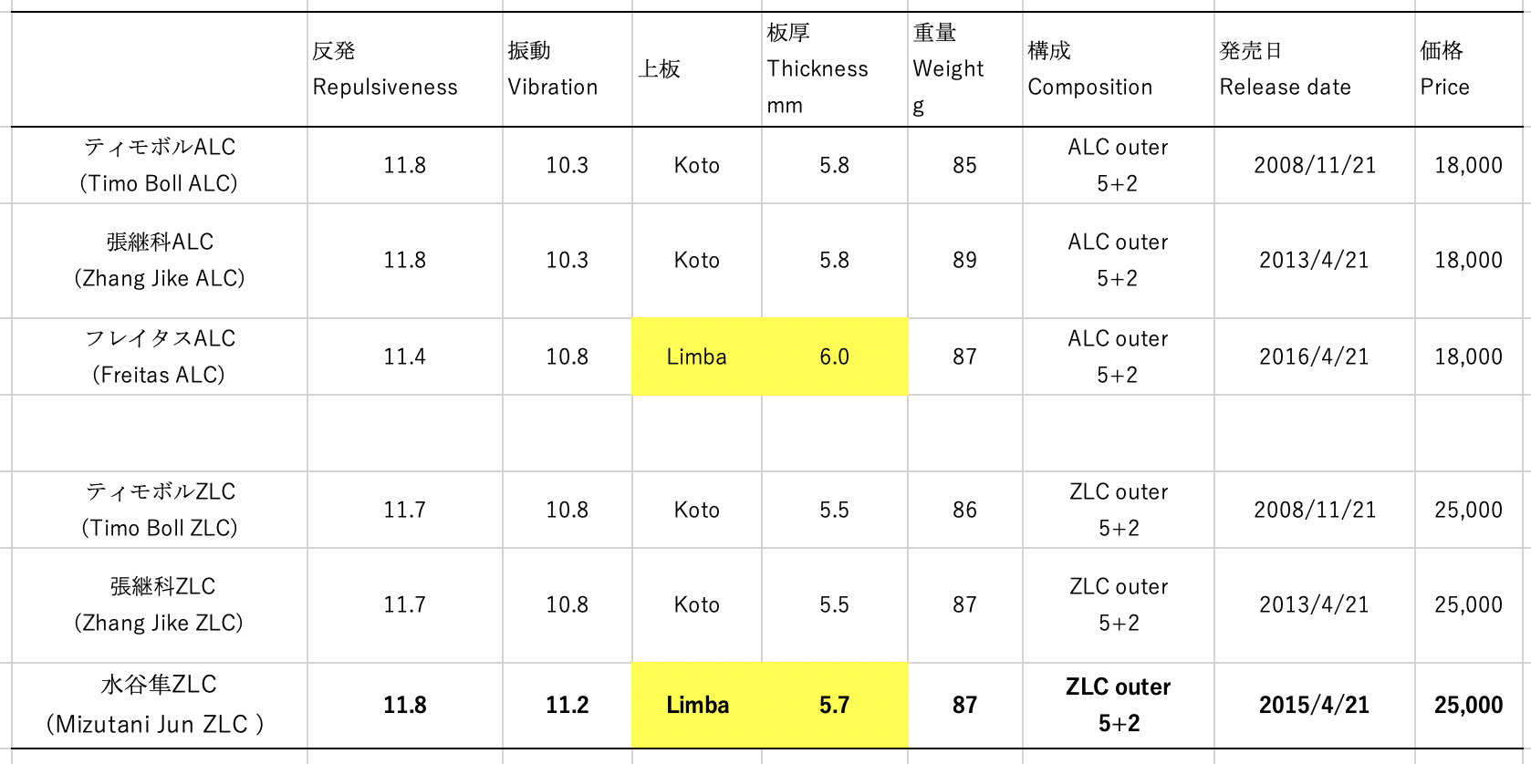 一般的なラバー、例えば、テナジー05では特厚、厚、中の3種類になります。キョウヒョウNEO3も同じく2.20 mm、2.15 mm、2.10 mm、と大きくは3種類 になりますね。
