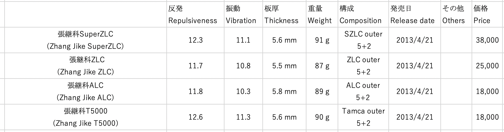張継科選手モデルの4本のラケットは、それぞれ採用されている特殊素材が異なっており、Super Zylon Carbon(スーパーザイロンカーボン、SZLC)、Zylon Carbon(ザイロンカーボン、ZLC)、Arylate Carbon(アリレートカーボン、ALC)、Tamca 5000(T5000)の4つになります。