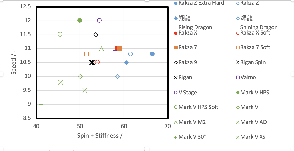 Coincidentally, when the performance values are quantified and compared, the Rakza Z EH is in the same position as the Rakza 7 software. Of course, reflecting the hardness, it can be said that Rakza Z EH is the rubber with the highest spin value. On the other hand, although it is faster than Shoryu, you can see that Rakza Z EH is faster than Rakza 7 and Rakza X. This area can be said to be a characteristic of adhesive rubber.