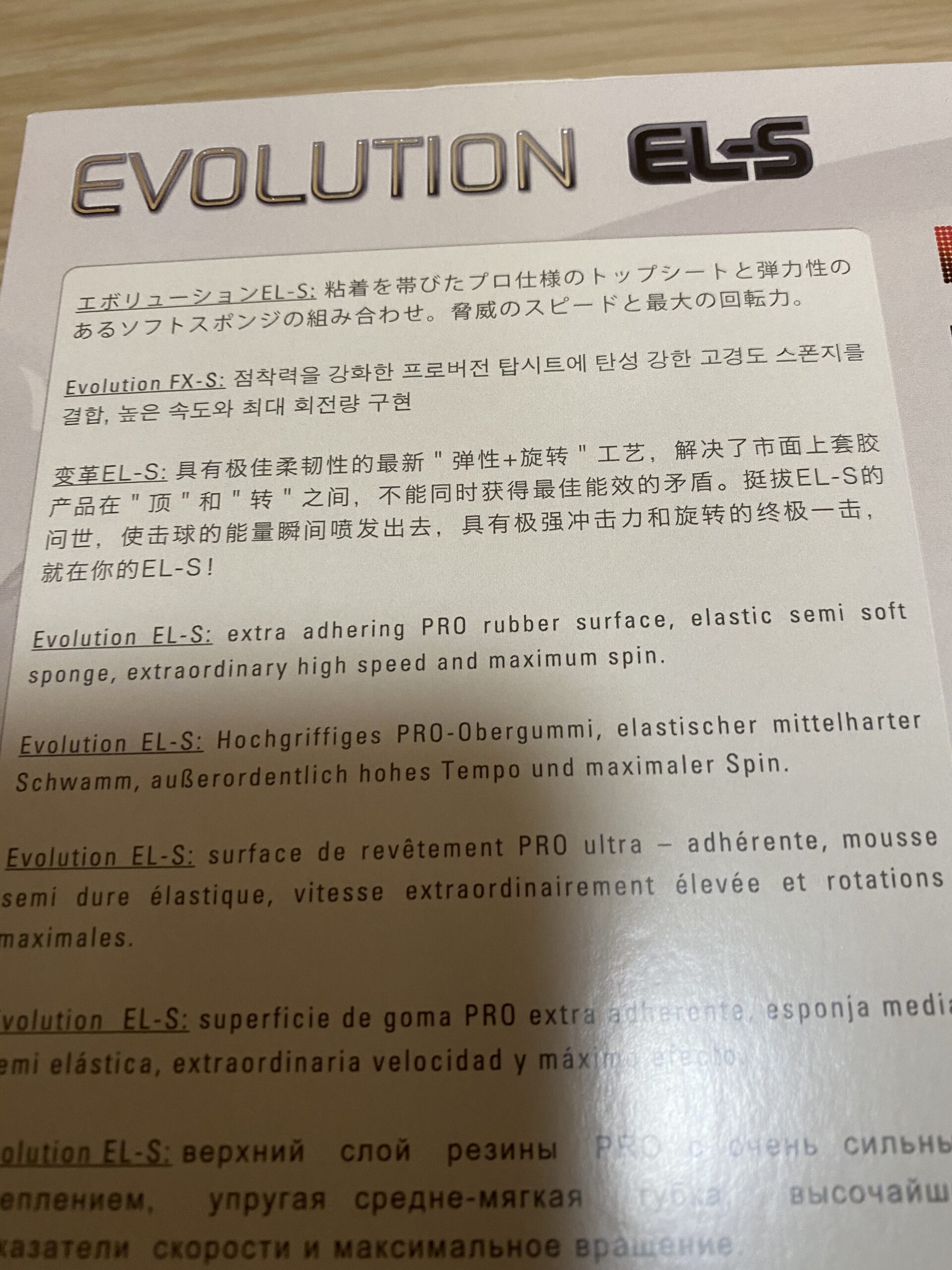 I will review one of Tiber’s rubber, Evolution EL-S. The rubber used by many contract players as a high-end rubber is the Evolution series. Currently, the Evolution series has the latest and highest performance MX-D, 3 types of hardness x 2 types of sheets = 6 types, and 50 ° of MX-P, totaling 8 types of rubber are on sale. The latest MX-D released in 2021 is clearly a rubber that sets it apart from other Evolution series rubbers. We have a review about that, so please take a look there. Review of Evolution MX-D (Evolution Maximum Dynamic) : https://katsuo000.com/review_evolution_mx_d/ Returning to the Evolution series, the three types of hardness are MX (maximum = approx. 47.5 °), EL (elastic = approx. 43 °), and FX (flexible = approx. 40 °). And the two types of sheets are P (power) and S (spin, slightly adhesive sheet). This page reviews EL (elastic) with a hardness of about 43 °, that is, EL-S (elastic spin), which is a combination of a medium hardness sponge and a slightly adhesive sheet. EL-S is a hit rubber, and TIBHAR also put out a color advertisement in the magazine Table Tennis Kingdom for the first time in 11 years. Now that the plastic balls have become harder and the rubber with medium hardness is often attached to the back side, I think that the most suitable rubber for the back side rubber will be EL-S. Let’s check the EL-S information posted on TIBHAR’s homepage.