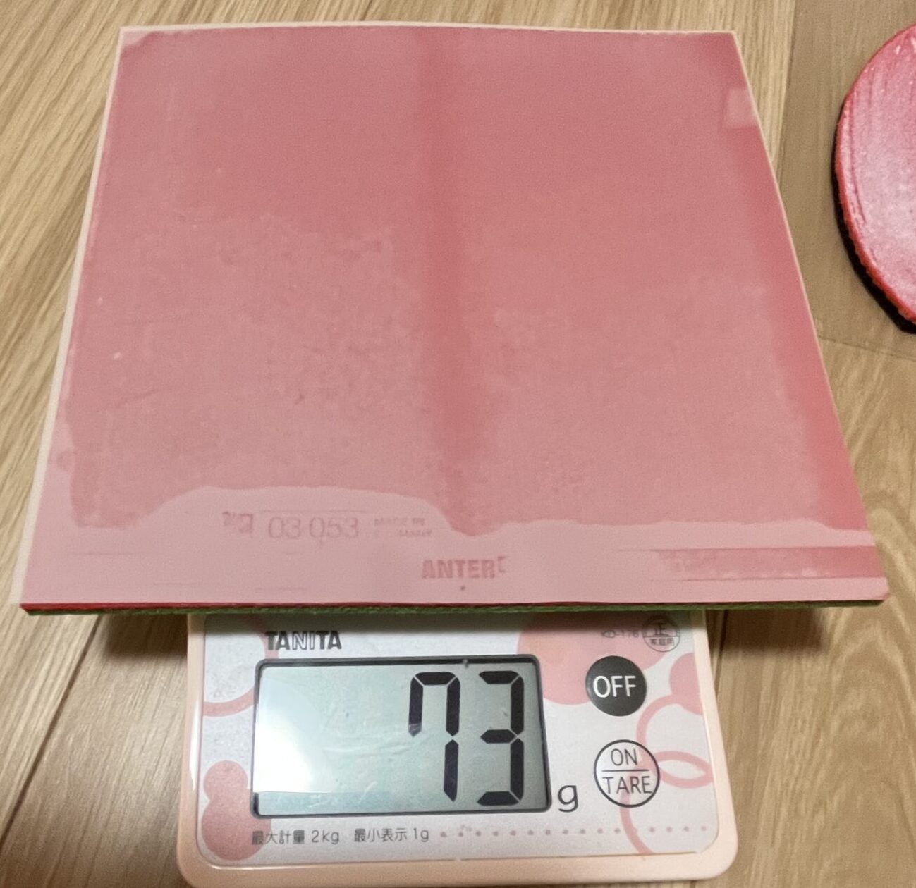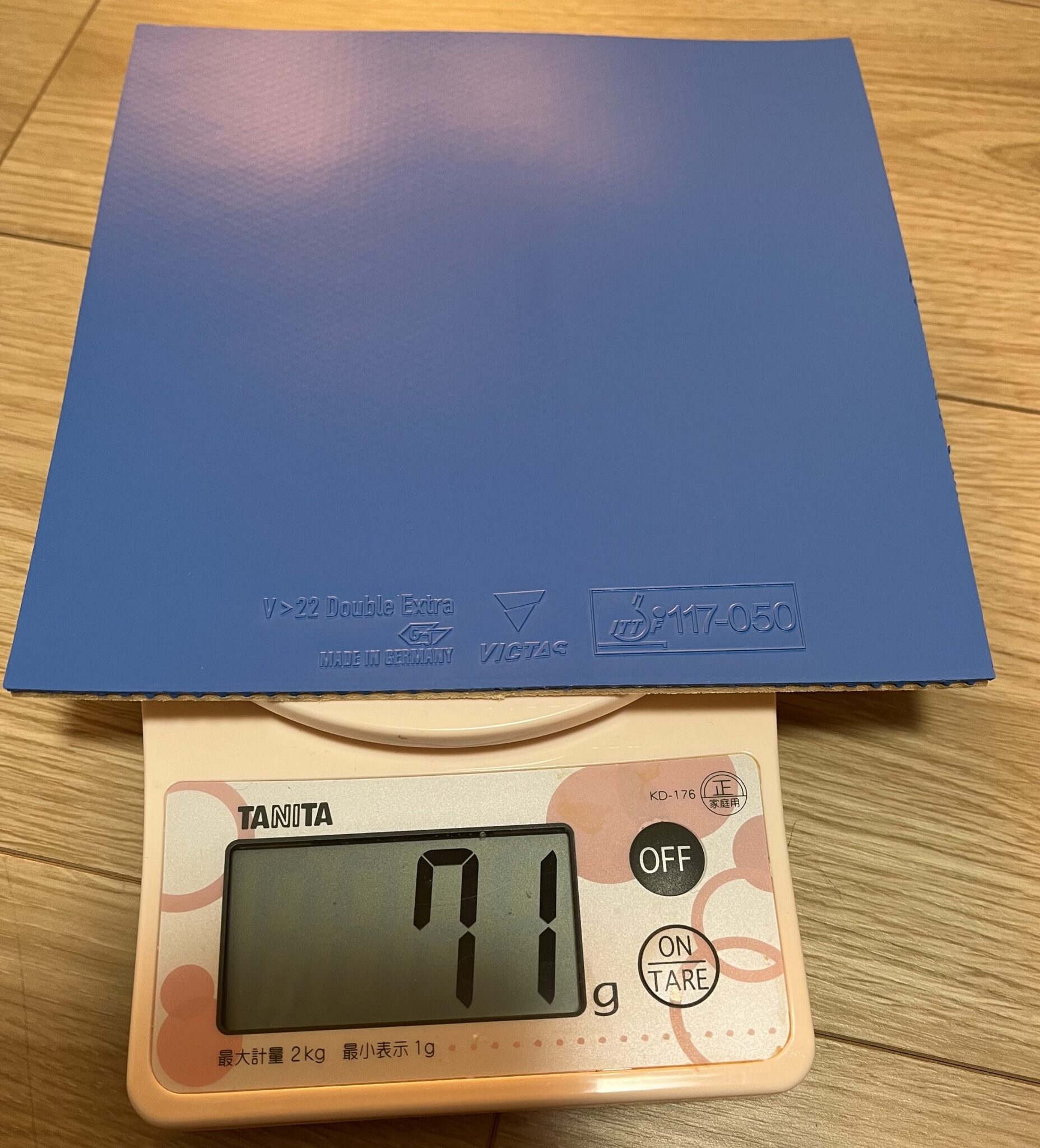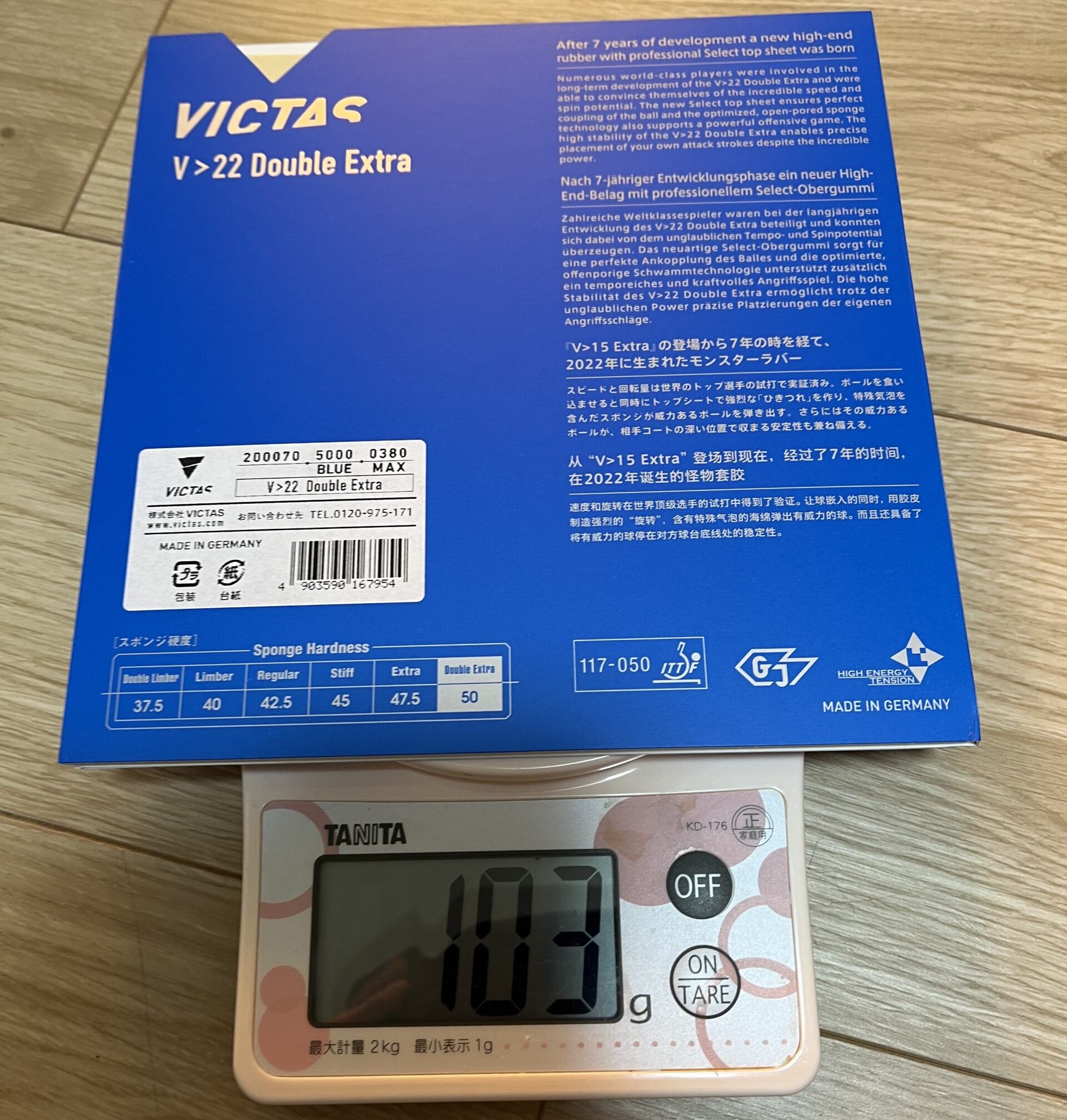 V>22 Double Extra (V>22ダブルエキストラ)に注目してみます。ぱっと見た印象でも、V>15 Extra (V>15エキストラ)に近いスポンジ形状と粒形状に見えるというのが一つの特徴といえるでしょう。おそらく、今ある最も良い技術で、V>15 Extra (V>15エキストラ)と同じコンセプトで作り上げたラバーがV>22 Double Extra (V>22ダブルエキストラ)ではないかと思います。続いて重量と硬度計比較になります。