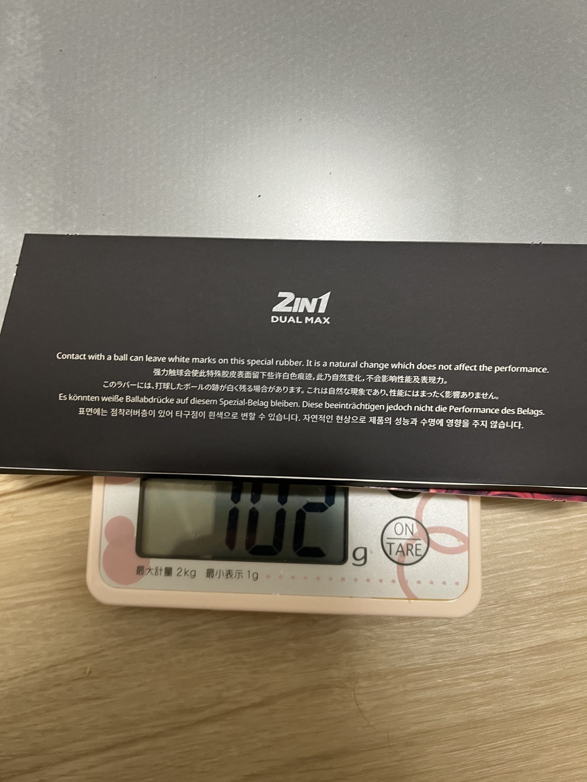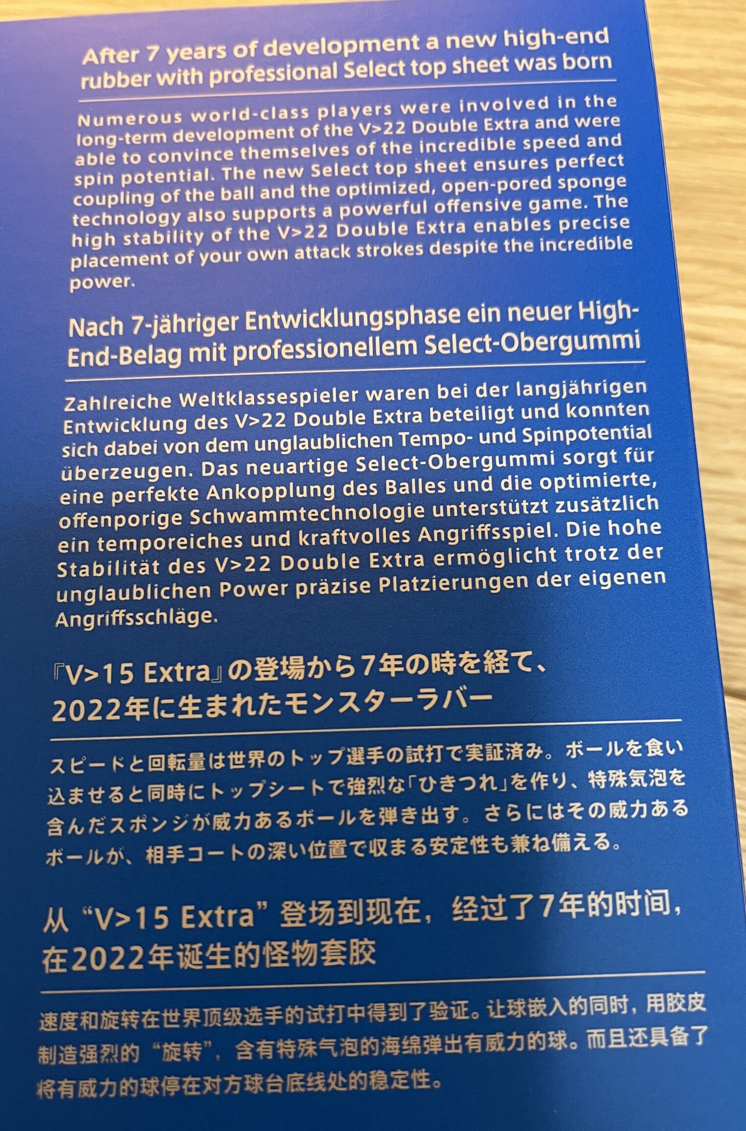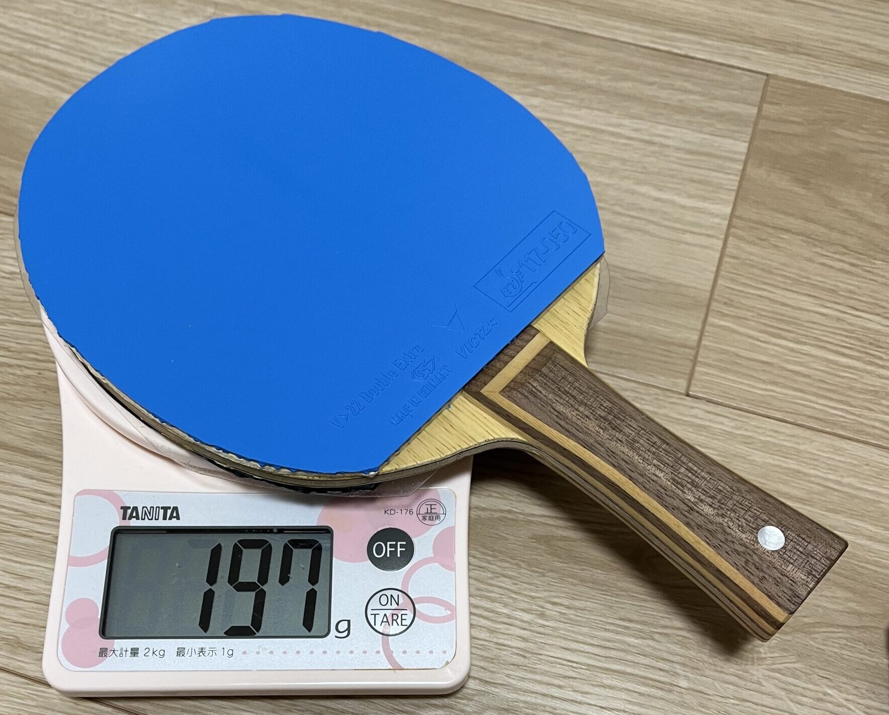 V>22 Double Extra (V>22ダブルエキストラ)に注目してみます。ぱっと見た印象でも、V>15 Extra (V>15エキストラ)に近いスポンジ形状と粒形状に見えるというのが一つの特徴といえるでしょう。おそらく、今ある最も良い技術で、V>15 Extra (V>15エキストラ)と同じコンセプトで作り上げたラバーがV>22 Double Extra (V>22ダブルエキストラ)ではないかと思います。続いて重量と硬度計比較になります。