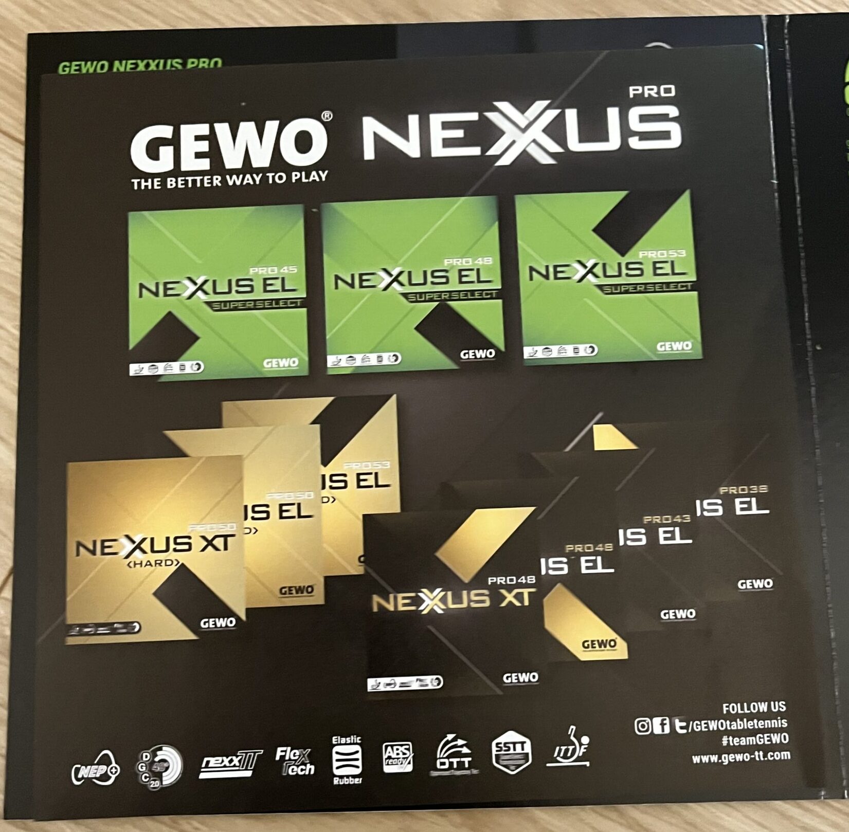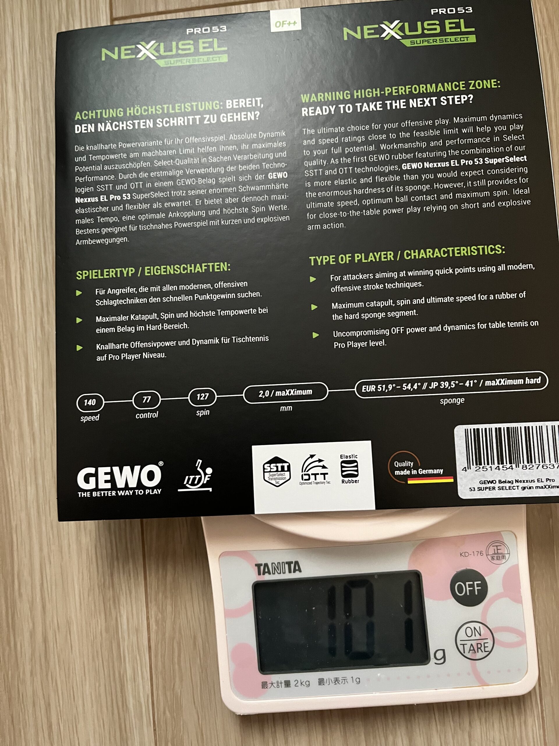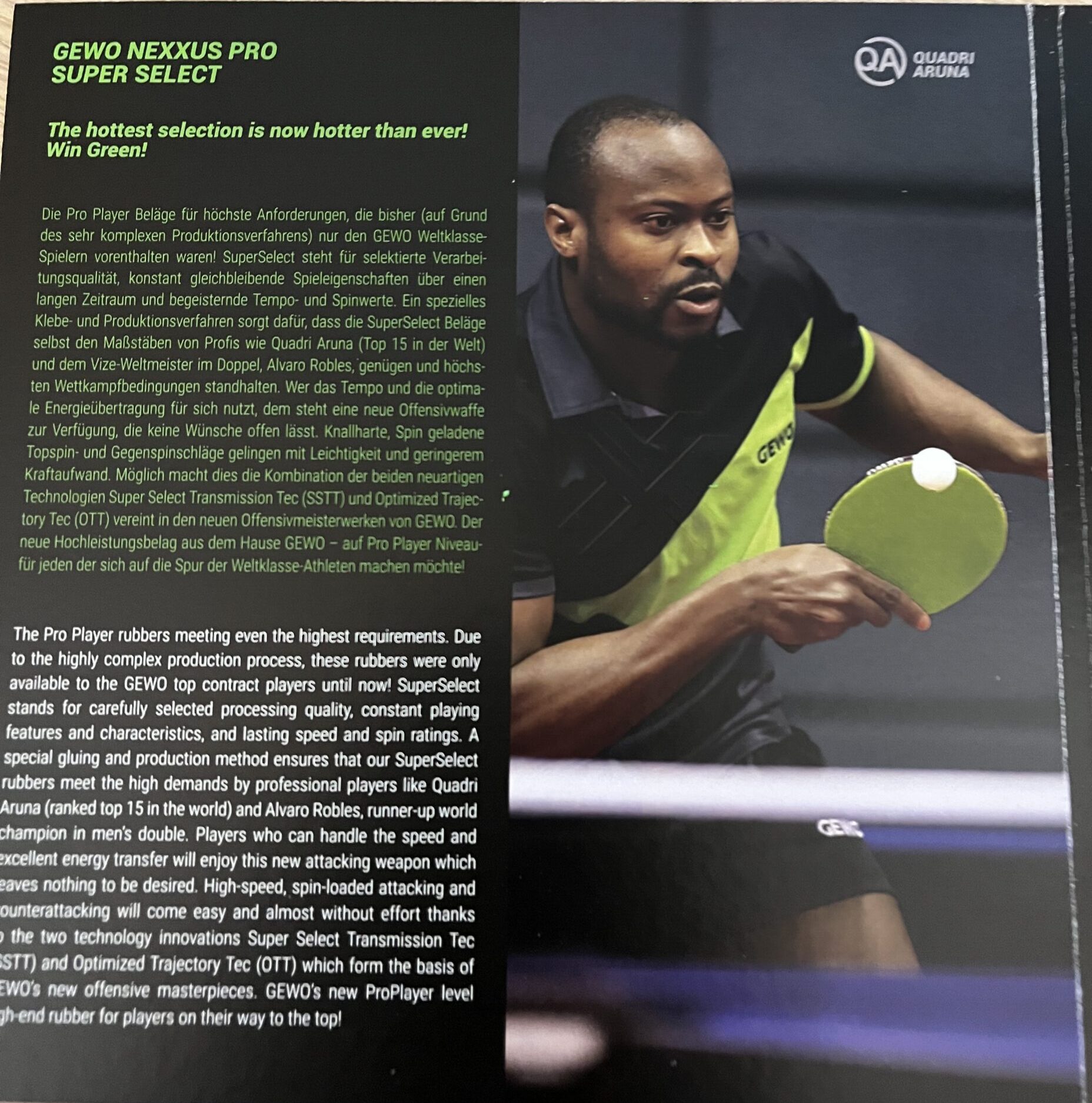 2023年初のレビューは、GEWO (ゲオ)のハイエンドラバーになります。GEWOはドイツの卓球用具メーカーで、有名な契約選手はナイジェリアのQuadri Akinade Aruna (クアドリ・アルナ)選手になりますね。アルナ選手はGEWOと契約する前は、joola (ヨーラ)の契約選手でそのころからヒノキ系合板のラケットを使ったパワフルで豪快なラリーを展開する選手でした。そんなヒノキ系のラケットを豪快パワフルに扱うアルナ選手が、ラバーに使用するのが今回レビューするGEWOのNexxus EL Pro 53 Super Select (ネクサスELプロ53スーパーセレクト)になります。このNexxus EL Pro 53 Super Select (ネクサスELプロ53スーパーセレクト)を使用する前は、Nexxus EL Pro 53 (ネクサスELプロ53)を使用されていたようです。以前のラバーは、katsuo000もレビューしておりますので、そちらをご参考ください。本レビューでは、Nexxus EL Pro 53 (ネクサスELプロ53)と比較しながら、Nexxus EL Pro 53 Super Select (ネクサスELプロ53スーパーセレクト)をレビューしていきたいと思います。