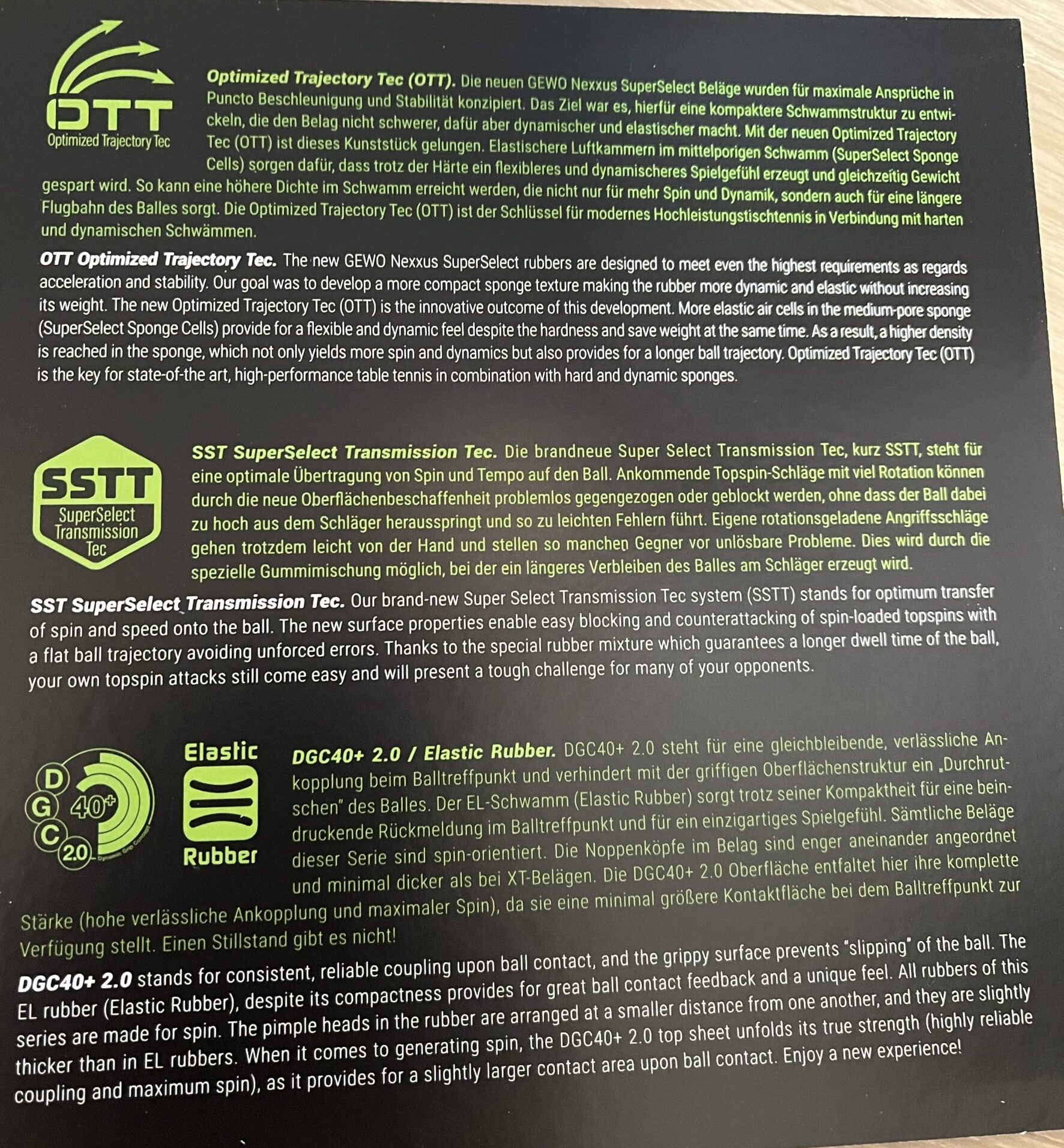 Nexxus EL Pro 53 Super Select (ネクサスELプロ53スーパーセレクト) 警告! ハイパフォーマンスゾーン 〜次のステップに進む準備はできていますか? 攻めるプレーのための究極の選択。最大限のダイナミクスと実現可能な限界に近いスピードと回転が、あなたの潜在能力を最大限に引き出すプレーをサポートします。セレクトクオリティーの職人技とパフォーマンス。GEWOのラバーで初めてSSTTとOTTの技術を組み合わせたGEWONexxus EL Pro 53 Super Select (ネクサスELプロ53スーパーセレクト)は、そのスポンジの高硬度を考えると、想像以上に弾力性と柔軟性に富んでいます。しかし、究極のスピード、最適なボールコンタクト、最大のスピンを提供します。小さい爆発的なスイングをする選手に最適で、台の近くでのパワープレーに理想的なラバーです。 プレーヤーのタイプ/特徴 – 現代的で攻撃的なストロークテクニックを駆使し、素早くポイントを獲得することを目指すアタッカー向け。 – ハードスポンジのラバーとしては、最大のカタパルト、スピン、究極のスピード。 – プロ選手レベルの卓球のために、妥協のないパワーとダイナミクスを実現。 GEWOリンク: https://gewo-tt.com/gewo-products/gewo-belag-nexxus-el-pro-53-superselect/