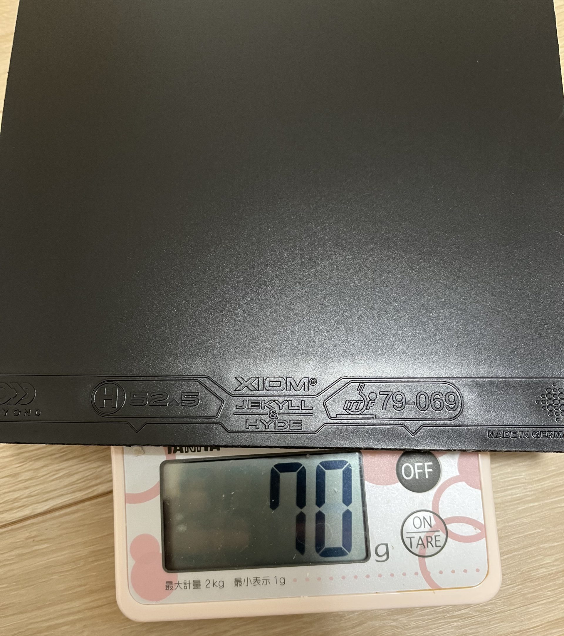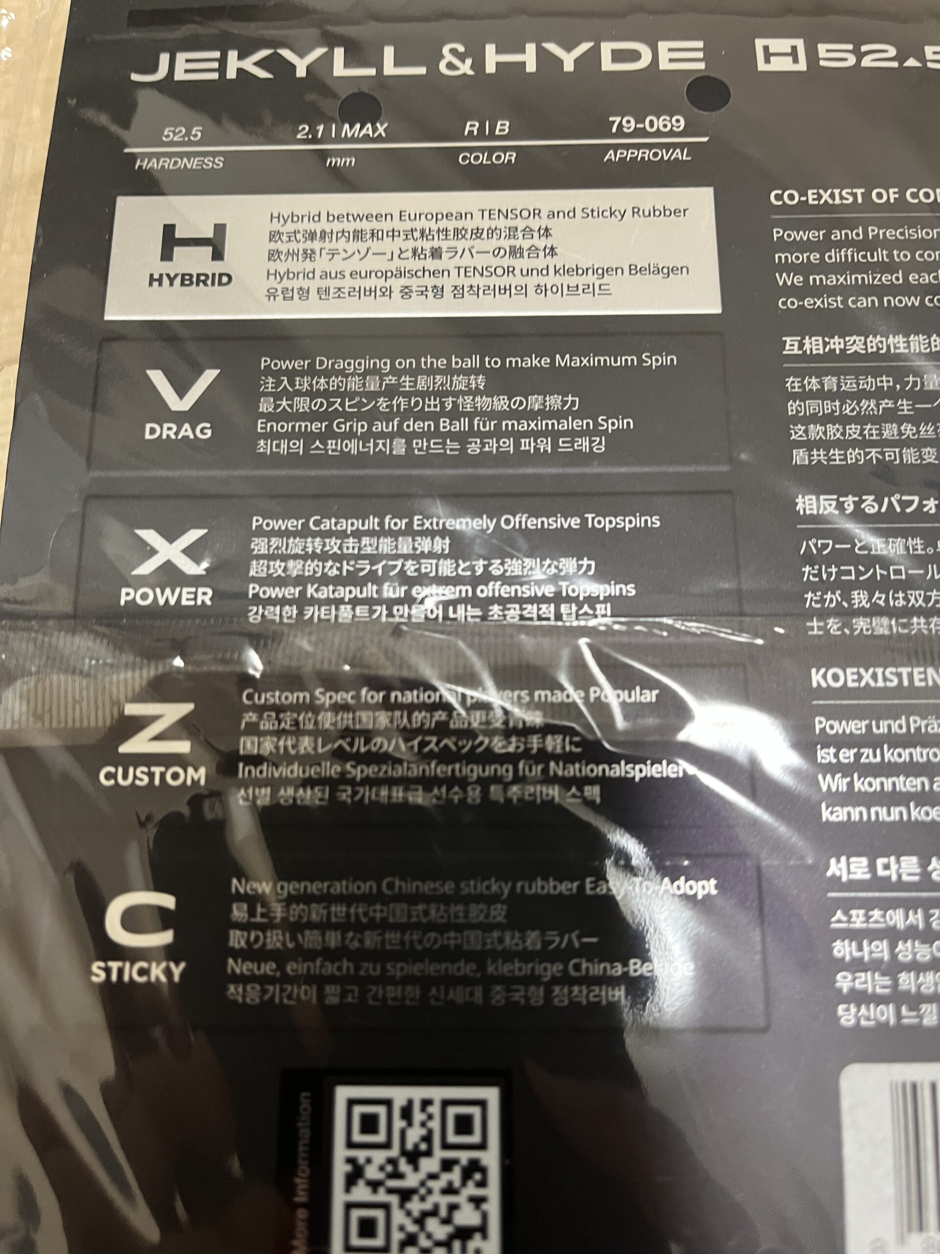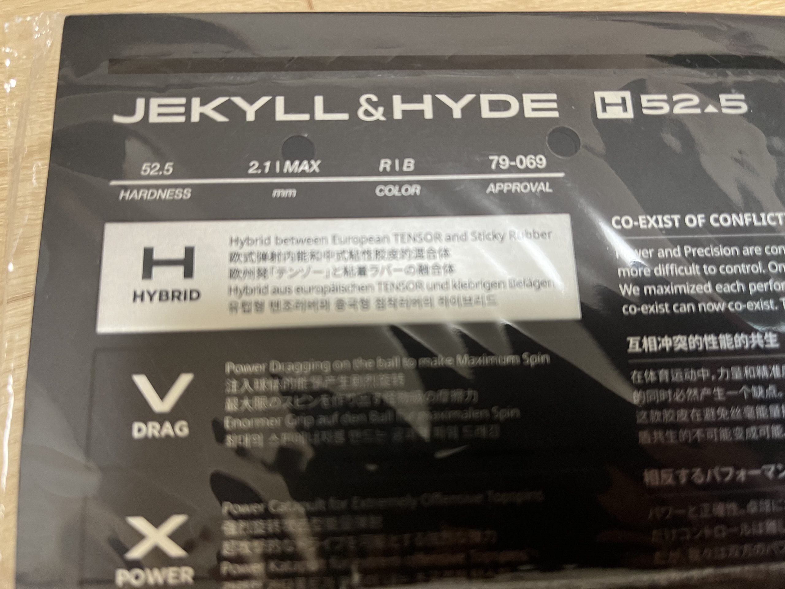 このラバー、初めはかなりOmega VII China Ying (オメガVIIチャイナ影)に似たラバーと思いましたが、フォアクロスのドライブ連打のときのスピード性能が抜群に高く、まるで、Dignics 64 (ディグニクス64)やBryce Highspeed (ブライスハイスピード)系の驚くようなスピード性能を体感しました。これは目が覚める速さですね!打球感はかなりOmega VII China Ying (オメガVIIチャイナ影)に似てるんですが、Omega VII China Ying (オメガVIIチャイナ影)よりも格段にスピードが速いと感じました。というか、弧線が弱い分直線的に飛ぶイメージがこのJekyll & Hyde H52.5 (ジキル&ハイド H52.5、J&H H52.5)だと思います。粘着テンションラバーといいながら、ここまでスピード性能の高いラバーは面白く特徴になると思いました。またスピード性能の高いスピン系テンションラバーは直線的な弾道であるために、やや下回転打ちは難しかったり、打点を落とせない感じがあります。ですがJekyll & Hyde H52.5 (ジキル&ハイド H52.5、J&H H52.5)は粘着ラバーらしさもあるので、下回転打ちもやりやすくて、多少打点を落としても弧線で入れやすいと感じました。現代プラボールや抗菌ボールにあうようなラバーだと思います。