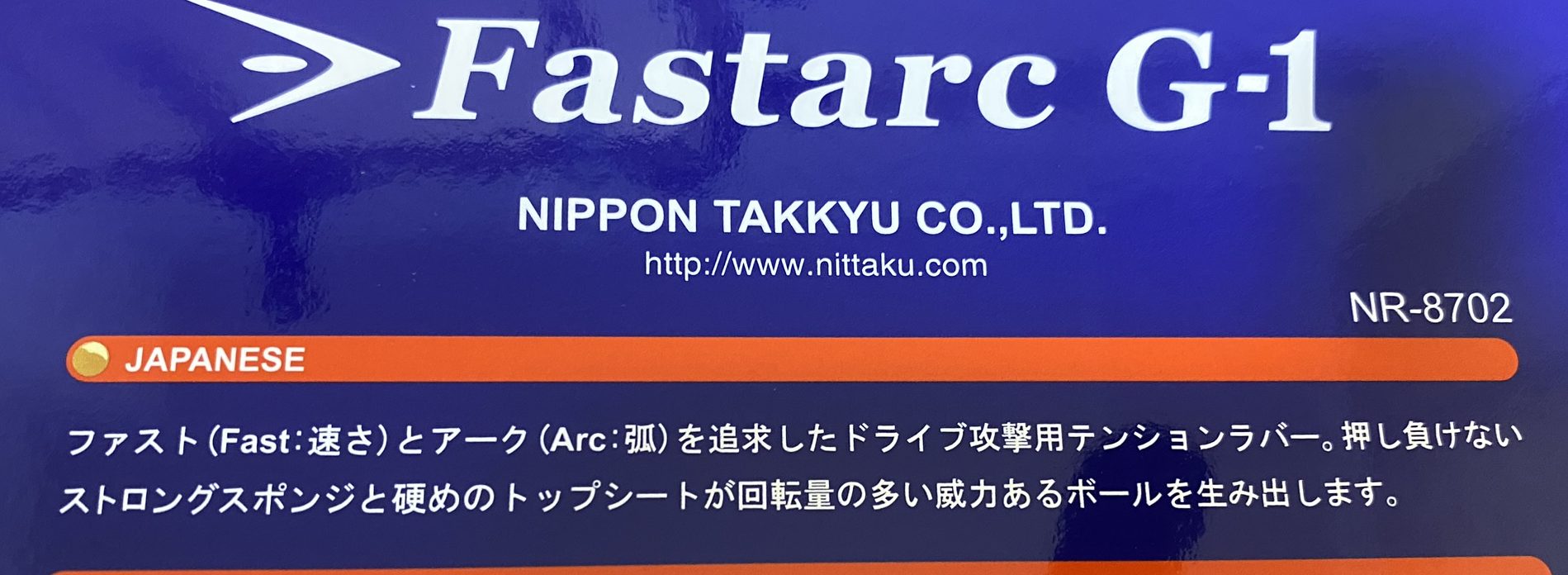 ファスタークG-1およびそれ以外のFastarc(ファスターク)シリーズの由来などについて触れさせていただきます。ニッタクさんによると、ファスタークの名前は、英語のFast(速さ)とArc(弧線)をくっつけた造語ということですね!ファスタークシリーズの中でも最も回転性能の高いラバーがファスタークG-1になります。