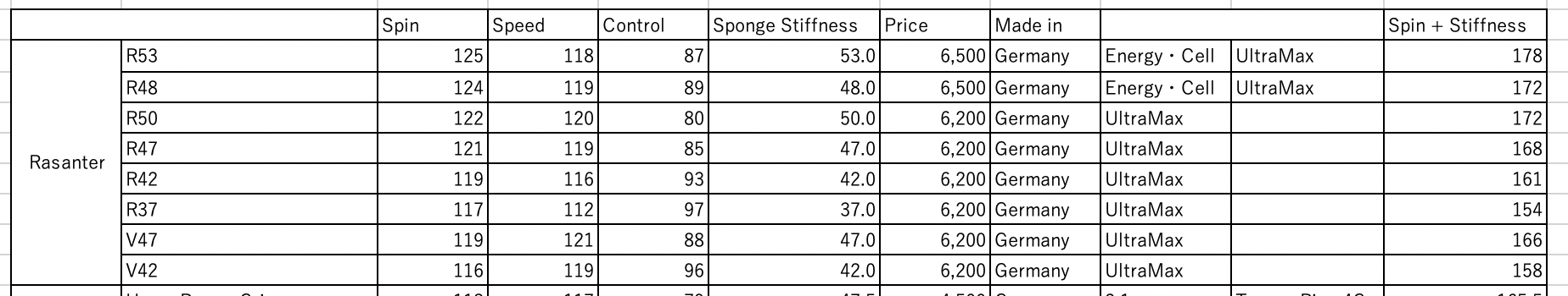 アンドロさん公表性能値比較になります。アンドロさんはスピードとスピンに加え、コントロールという項目を加えているのが特徴でしょうか。やはりエナジーセル採用のR53とR48は高い性能となっていて注目のラバーになりますね!