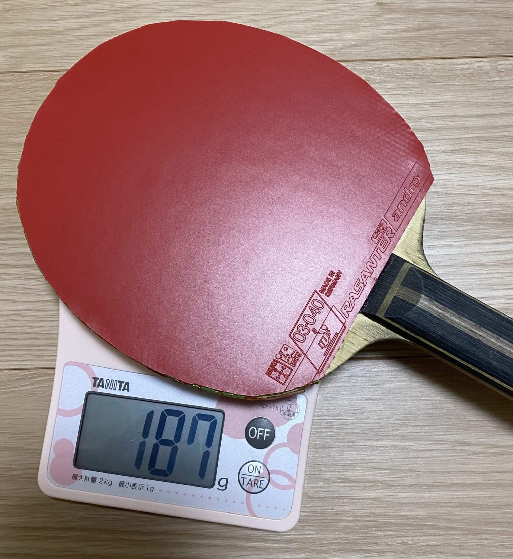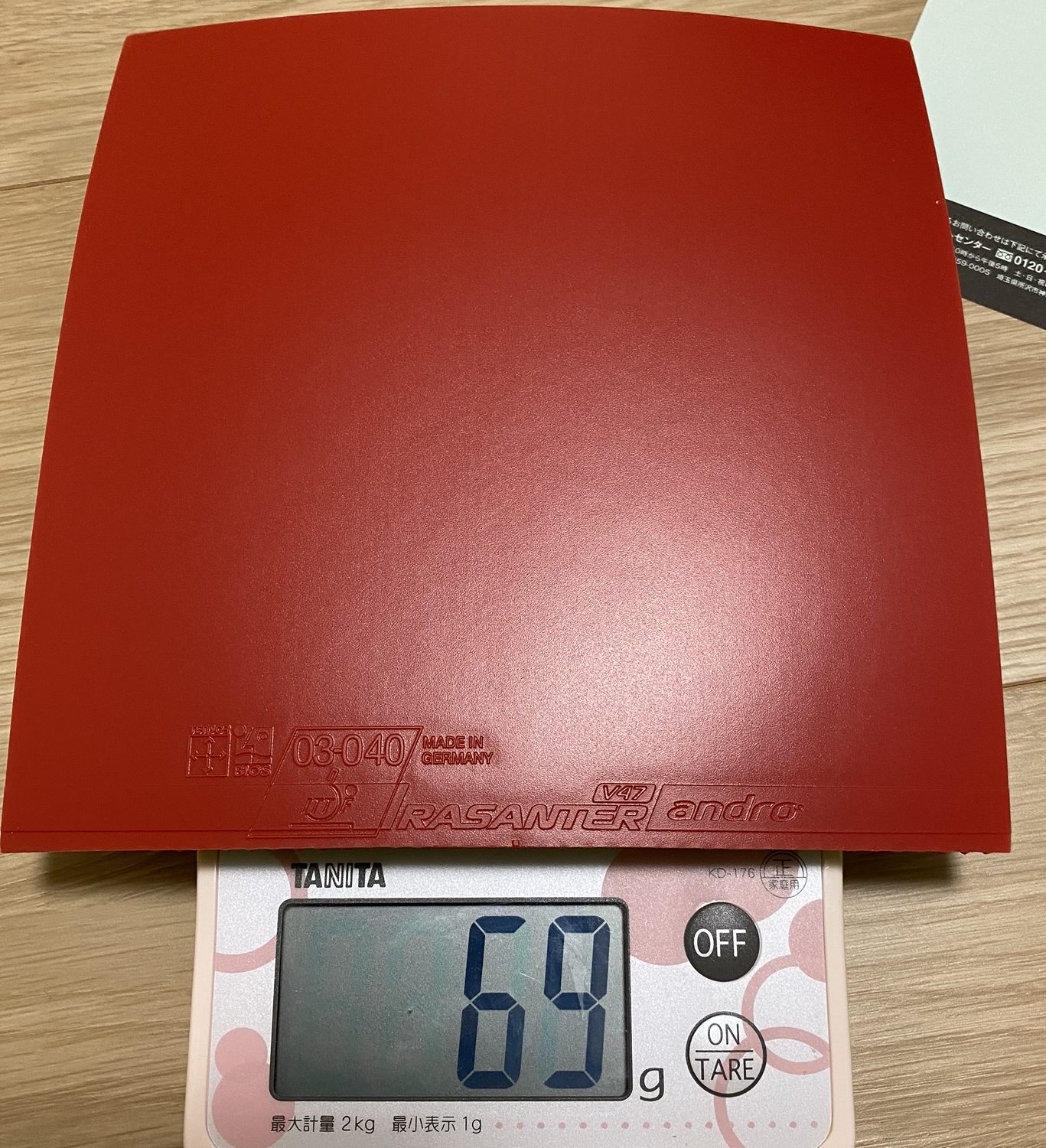 切る前で70 gをきっていましたが、貼ると思ったより重かったです。実際、どちらかというと回転もしっかりかかるスピード系ラバーだと思いますね。