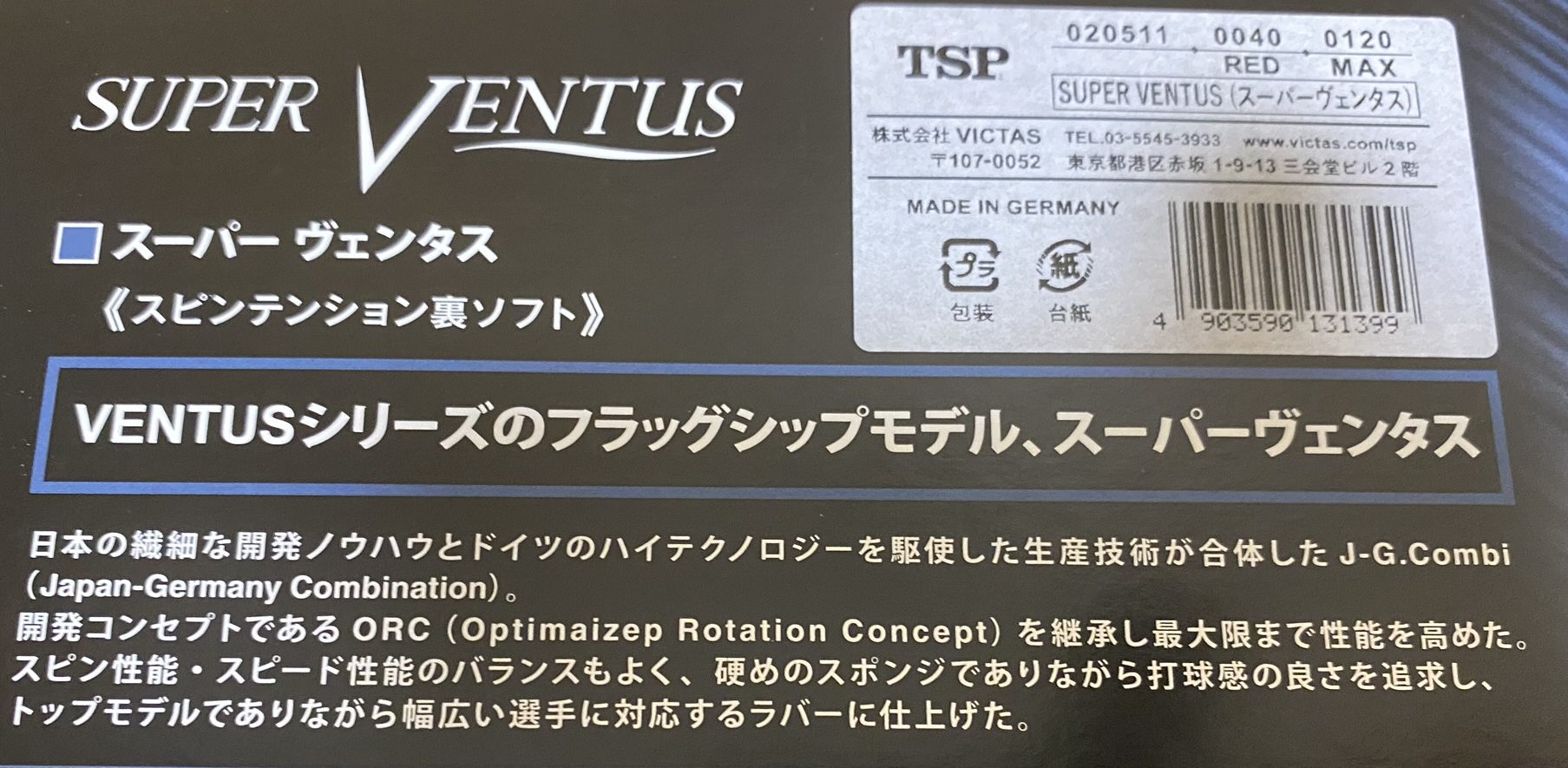 Ventus(ヴェンタス)シリーズはTSPのテンションラバーシリーズになります。他にもテンション系ラバー、たとえばRegalis(レガリス)やAgrit(アグリット)などのテンション系ラバーが販売されていますが、TSPのテンション系ラバーで最も有名なのがヴェンタスシリーズだと思います。扱いやすくて、それなのにしっかりと回転とスピードが出せるラバーがヴェンタスシリーズだと思いますね。ヴェンタスシリーズはJapan Germany Combinaiton(JGコンビ)という日独両技術の融合開発のラバーで、Optimized Rotation Concept(ORC)という弧線を作る技術の適用がされているそうです。こういったテクニカルワードをつけて商品を販売していくことで他のラバーとは違って高性能な気がしますね。VICTASのラバーも同じような説明がされていますので同じような工場で製造されていそうです。