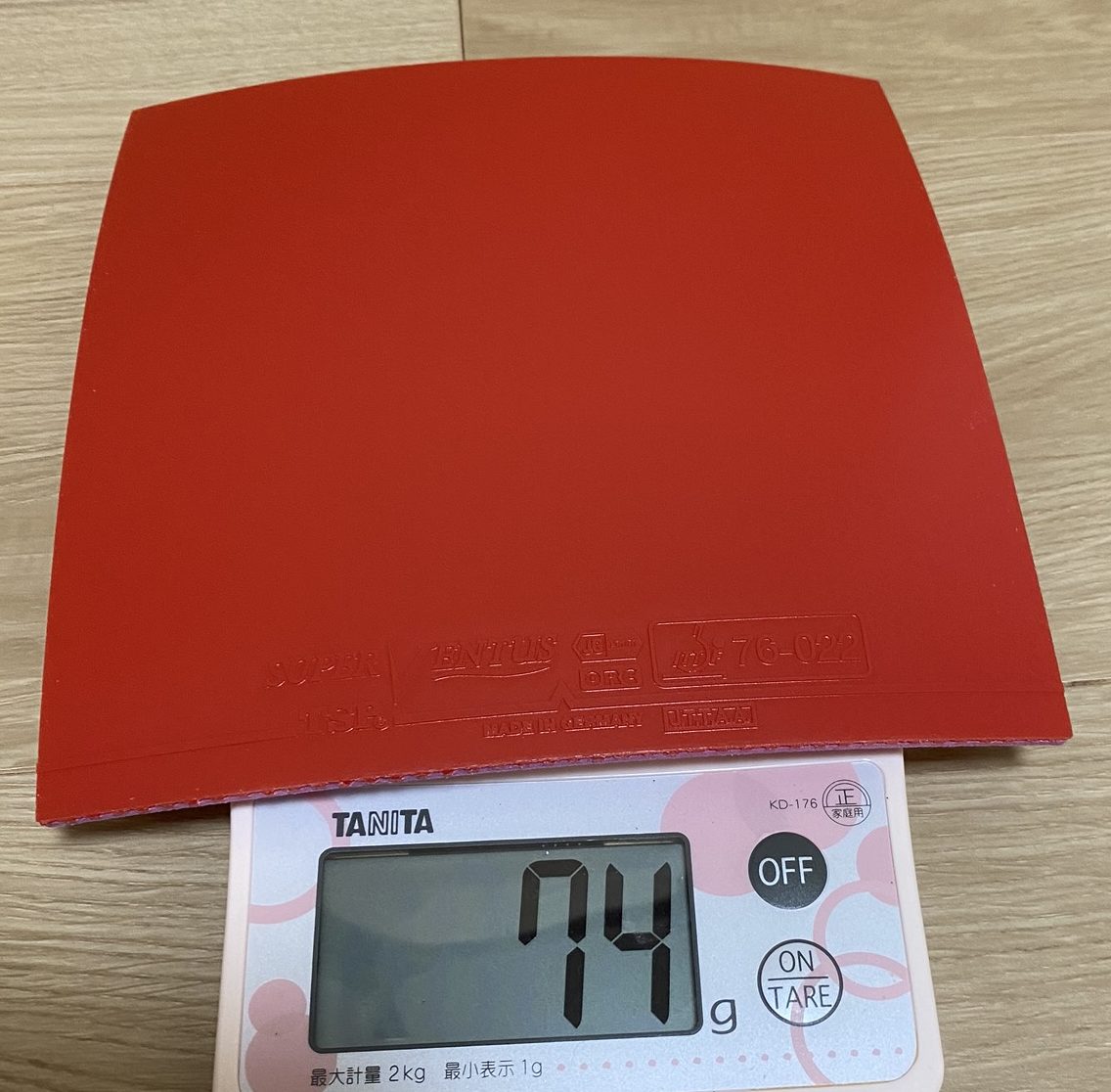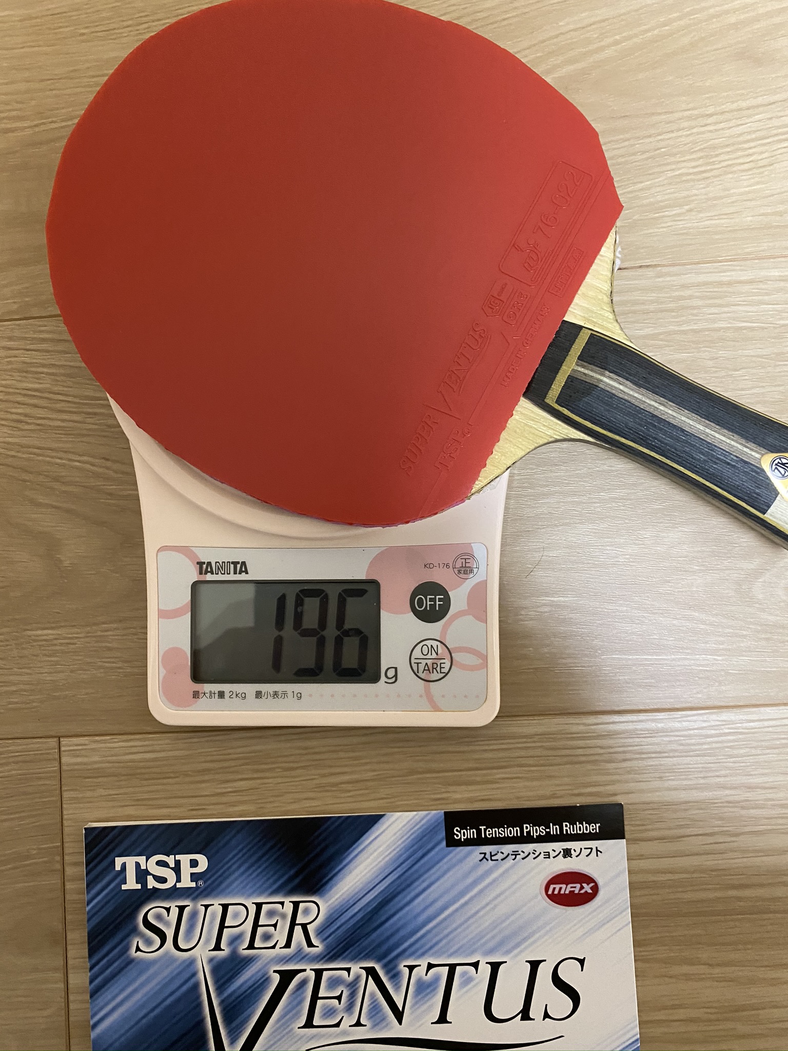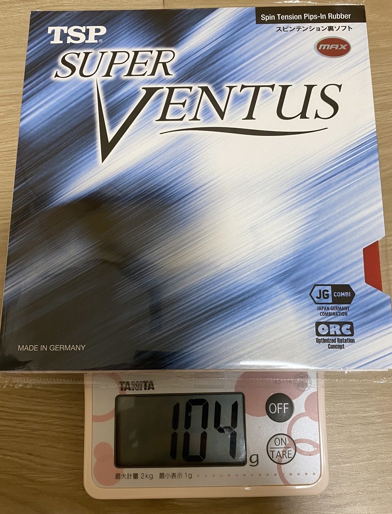 Super Ventus(スーパーヴェンタス) JG Combi(Japan Germany Combination) ORC(Optimized Rotation Concept) ・Speed:15.25 ・Spin:11.75 ・Sponge Thickness: 1.8 mm、2.0 mm、MAX ・Sponge硬度:47.5(ドイツ基準) ・5,200 円 + 税 ・74 g(切断前) → 49 g(張継科ZLCに貼って)